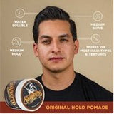 It all started with one pomade - Suavecitos Original Hold Pomade. This is a uniquely scented styling water based product that is formulated to keep your hair in place all day long. It combs into your hair easily with its creamy consistency and provides a strong grip for a slick back, pompadour, side part or any hairstyle you are rocking. This pomade is water-soluble, washing out with no effort using only water leaving your hair feeling untouched. No special shampoos or soaps are needed for removal. It dries with a medium firmness and medium shine. No flakes and no harsh chemicals.Proudly made in the United States.Directions: Apply to DRY hair for less shine and a stronger hold. Apply to DAMP hair for more shine and a lighter holdStart with a quarter sized amount in your palm. Rub product into hands and fingers. Work into hair with fingertips from the roots up. Ensure even distribution of product. Comb to desired style. To remove, simply wash out with water.Medium hold - medium shineWashes out with just waterNo harsh chemicals and never flakesGreat for: pompadours, slick backs and side partsIt started in a small houses kitchen with a couple of friends and family. They got together to create a pomade that would be used between them for their nights out on the town. The formula was made and the scent was found. The pomade was used daily between them and local barbers started to catch on. From there the pomade left the small circle of friends and family. It made its way in zip lock baggies and tupperware containers to barbers eager to get their hands on it. A name was given. Then a logo was devised. It was no longer a secret anymore and Suavecito Pomade was born.*Due to limited supplies, the bottle and cap you receive may be different than pictured.Suavecito Pomade is a uniquely scented water-soluble hair pomade has a creamy consistency and provides a strong grip for maximum styling flexibility.Suavecito Pomade is a uniquely scented water-soluble hair pomade has a creamy consistency and provides a strong grip for maximum styling flexibility.