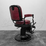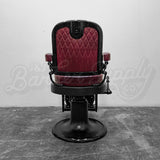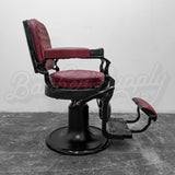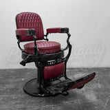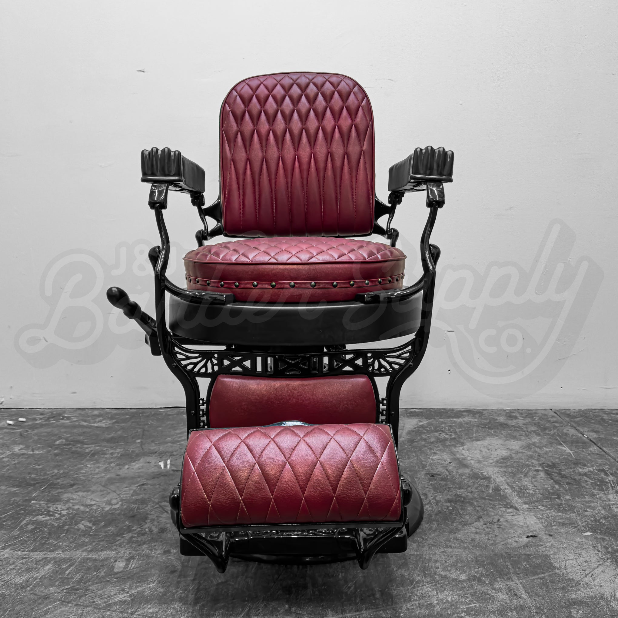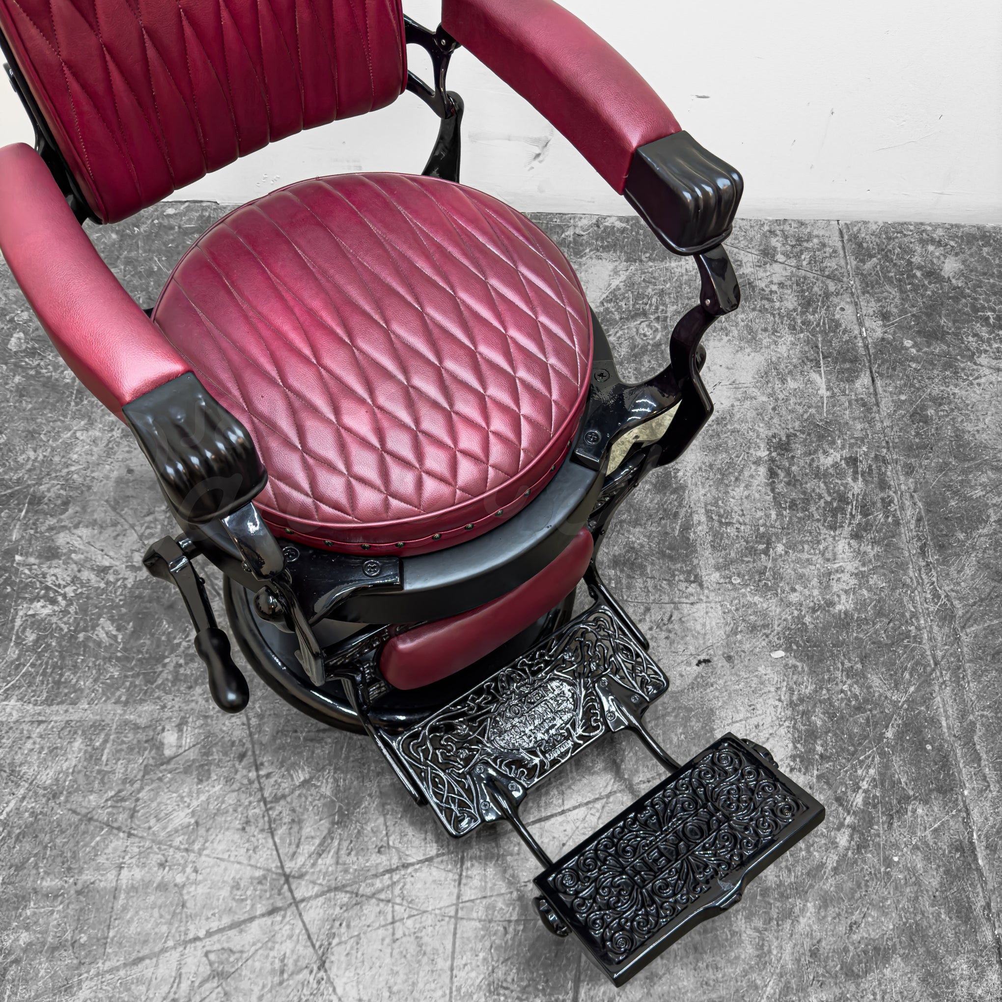 Vintage Koken barber chair, fully restored as follows: Matte Black Porcelain Gloss Black Metal Alsace Diamond Stitched Upholstery Marbled Red Automotive Grade Material Hydraulic Pump Refurbished Headrest Included (not shown in pictures)